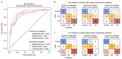 最后,本研究從代謝物、微生物菌“種”及兩者組合水平訓(xùn)練“隨機(jī)森林”(RF)分類器,鑒定IBD病癥和IBD子集,受試者工作曲線(ROC)描繪RF分類器的假陽性率和準(zhǔn)確率,混合矩陣評(píng)估PRISM隊(duì)列IBD子集RF分類器。結(jié)果顯示,所有RF分類器對(duì)IBD患者和健康人群的辨識(shí)效果良好,AUC值為0.86-0.92,交叉驗(yàn)證結(jié)果(AUC:0.90-0.92)更優(yōu)于獨(dú)立驗(yàn)證結(jié)果(AUC:0.86-0.89)(圖10.a)。PRISM隊(duì)列中,代謝物、微生物菌“種”及兩者組合水平預(yù)測(cè)UC、CD和健康人群的準(zhǔn)確率為64-65%,該結(jié)果雖然不如案例/對(duì)照成功,但仍高于隨機(jī)預(yù)測(cè)(正確率:30%)(圖10.b),將PRISM訓(xùn)練IBD子集RF分類器應(yīng)用于荷蘭人群時(shí)(用于人類疾病驗(yàn)證),輸入數(shù)據(jù)類型之間差異較大(圖10.b)。