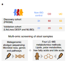 1.? 樣本收集(糞便):①PRISM(麻省總院IBD前瞻注冊(cè)試驗(yàn)):CD患者(68例),UC患者(53例),健康人群組(34例)(Fig. 1a);②LifeLines DEEP和NLIBD(荷蘭北部人群前瞻研究,用于人群疾病的驗(yàn)證):CD患者(20例),UC患者(23例),荷蘭北部健康人群(22例)(圖1.a)。