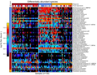 基于Bray-Curtis算法的距離矩陣(PCoA)發(fā)現(xiàn),CD患者與健康人群腸道菌群結(jié)構(gòu)差異較大,而UC患者與前兩者之間并無明顯的區(qū)別,UC患者組內(nèi)分布也較零散(圖1.c.1.e)。為了進(jìn)一步探究,本文運(yùn)用線性建模研究195個(gè)“種”水平微生物。在IBD患者與健康人群之間發(fā)現(xiàn)了50種差異豐度微生物,其中35種在IBD患者中豐度較高,Roseburia hominis、Dorea formicigenerans和Ruminococcus obeum在健康人群中富集最多。與很多IBD研究報(bào)道一致,IBD患者的微生物種類明顯減少,多樣性普遍降低?!胺N”水平未分類的Roseburia(氏菌屬)在UC和CD患者中顯著富集,Bifidobacterium breve和Clostridium symbiosum僅富集于UC患者,CD患者具有20種獨(dú)特且豐富的菌(如R. gnavus、Escherichia coli和Clostridium clostridioforme)(圖5)。