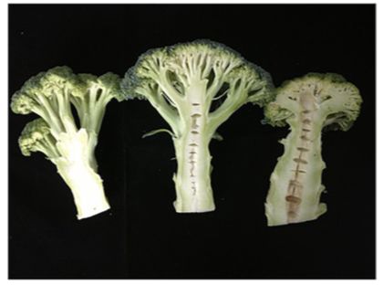 西蘭花是一種重要的蔬菜作物,其花頭富含維生素、礦物質和葡聚糖苷等次生代謝產(chǎn)物,營養(yǎng)價值高。但是在西蘭花的商業(yè)生產(chǎn)中經(jīng)常出現(xiàn)空心莖現(xiàn)象——靠近空腔的髓組織會被吹散甚至變黑。出現(xiàn)這種現(xiàn)象的花頭不受消費者所喜愛,從而給生產(chǎn)者帶來了嚴重的經(jīng)濟損失。針對這種現(xiàn)象,作者利用西蘭花DH群體構建了高質量的遺傳圖譜,并在遺傳圖譜中鑒定出控制空心莖性狀的位點,進而找到有利基因應用于育種中。