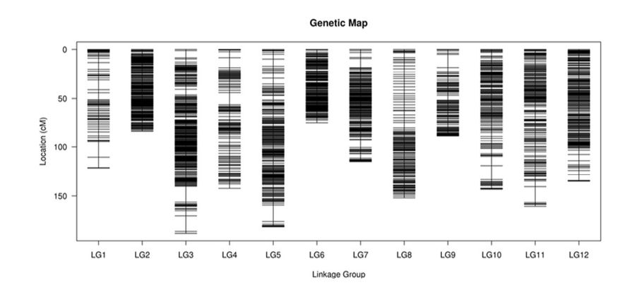 開發(fā)了185,349個SLAF標記,其中,20,250個SLAF標記可以成功分型,最終上圖的標記為4787個,分布于9個LG中,構建一張平均圖距為0.22cM的遺傳圖譜(如下圖),標記間最大gap超過10cM,這可能是由于小孢子培養(yǎng)構建DH群體的過程中,可能某種基因型更容易形成胚胎和再生植株,從而產(chǎn)生偏分離或某段染色體區(qū)域中無個體發(fā)生重組。