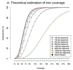 根據(jù)兩個(gè)人類數(shù)據(jù)集的錯(cuò)誤情況和read長(zhǎng)度,作者對(duì)兩條人的染色體模擬了50X?Pacbio?和ONT?read 。純粹的統(tǒng)計(jì)分析發(fā)現(xiàn),近10X覆蓋度的數(shù)據(jù)(平均長(zhǎng)度10kb)就足夠去推斷所有SV斷點(diǎn)(一瞬間覺得自己可以省好多錢有木有),然而對(duì)于100bp的短read雙端測(cè)序至少要25X覆蓋度。當(dāng)前這個(gè)統(tǒng)計(jì)只是一個(gè)理想情況,比如缺乏了重復(fù)和覆蓋度的偏移,因此是低估了所需的覆蓋度。