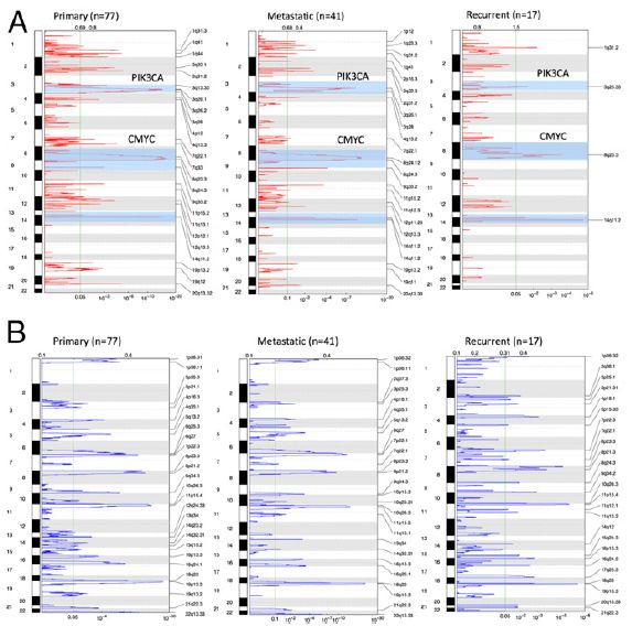 成對外顯子測序數(shù)據(jù)SCNA分析表明,在原發(fā)灶與復(fù)發(fā)灶匹配的17名患者中,4名患者獲得了PIK3CA擴(kuò)增(3q26),2名患者在復(fù)發(fā)腫瘤中獲得了c-MYC擴(kuò)增(8q23-24)。GISTIC分析表明,PIK3CA和c-MYC擴(kuò)增在樣本間具有顯著重現(xiàn)性,其頻率在復(fù)發(fā)灶、轉(zhuǎn)移灶和原發(fā)灶依次降低。