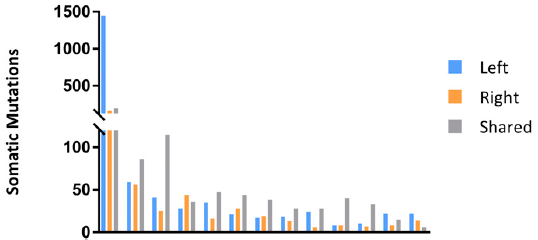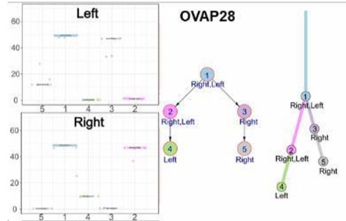 2、研究者也對13對雙側(cè)卵巢癌(synchronous bilateral ovarian cancer,SBOC)進(jìn)行了測序,評估腫瘤克隆進(jìn)化,以確定左右兩側(cè)腫瘤是否獨(dú)立地作為2個不同的腫瘤,還是分別代表原發(fā)性和轉(zhuǎn)移性腫瘤。分析表明,體細(xì)胞突變在2側(cè)腫瘤廣泛共享,所有病例中均顯示2側(cè)腫瘤起源于共同的祖先。