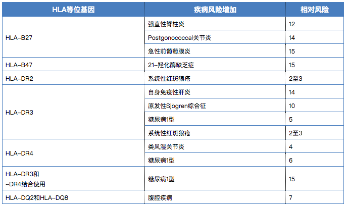 1972年Russel報(bào)告銀屑?。ㄅFぐ_)患者攜帶HLA-B13或HLA-B17。此后陸續(xù)發(fā)現(xiàn)大量其它疾病與特定的HLA相關(guān),其中,HLA-B27抗原見(jiàn)于大約90%的強(qiáng)直性脊椎炎病人,由此HLA-B27在臨床檢測(cè)中作為強(qiáng)直性脊柱炎的標(biāo)志物,以至使HLA分型具有了診斷價(jià)值,甚至,能較早地證實(shí)疾病亞型之間的臨床區(qū)別,例如,尋常銀屑病與HLA相關(guān),而膿皰性銀屑病則不然;青少年性胰島素依賴型糖尿病與HLA-B8、HLA-Bw15和HLA-B18相關(guān),而晚期發(fā)作型糖尿病并無(wú)這種相關(guān)性。因此,特定類型的HLA便成為某些疾病的遺傳標(biāo)志。在疾病研究的延伸面,是關(guān)于HLA與長(zhǎng)壽的關(guān)系,目前亦形成一個(gè)新的研究熱點(diǎn)。目前研究比較清楚的幾個(gè)HLA與自身免疫疾病相關(guān)關(guān)系如下表:
