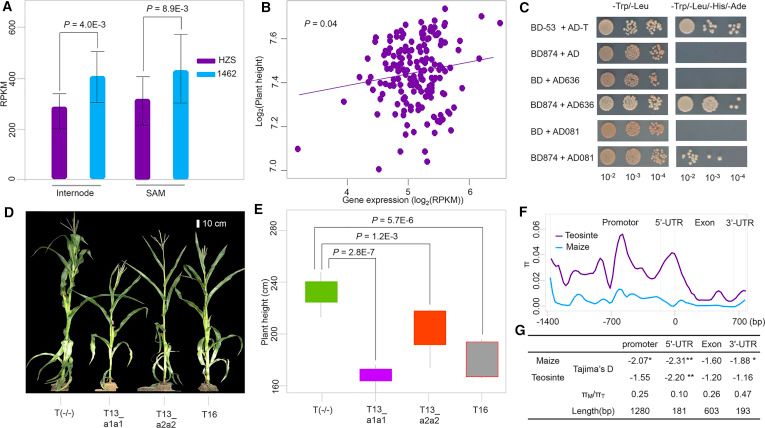為進(jìn)一步確定候選基因,本研究又通過RNA-seq分析發(fā)現(xiàn),Zm00001d020874表達(dá)量在雙親的莖頂端分生組織(SAM)與幼嫩節(jié)間組織中存在顯著性差異。基于擬南芥同源蛋白功能與smoothLOD定位信號,認(rèn)為Zm00001d020874qPH7的候選基因,并且后續(xù)的CRISPR基因敲除,蛋白互作驗(yàn)證等實(shí)驗(yàn)均暗示Zm00001d020874是控制株高的基因。