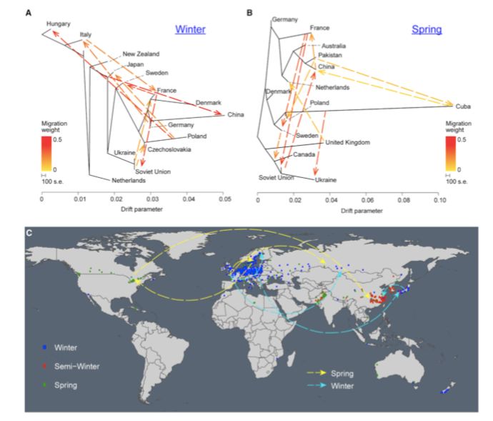 進(jìn)一步計(jì)算世界地圖上顯著的基因流數(shù)目之后,在冬型和春型油菜中發(fā)現(xiàn)了四個(gè)主要基因流(圖2C)。冬型油菜的基因流從法國(guó)到俄羅斯(weight=0.5)、法國(guó)到瑞典(weight==0.3)、波蘭到日本(weight==0.3)和日本到中國(guó)(weight==0.3),而春型油菜的基因流從法國(guó)到俄羅斯(weight==0.5)、法國(guó)到瑞典。經(jīng)德國(guó)(weight=0.4),瑞典到加拿大(weight=0.2),加拿大到中國(guó)(weight=0.5)。沒(méi)有顯著的生態(tài)型漂移事件(inter-ecotype drift events)(圖2 A、B)。