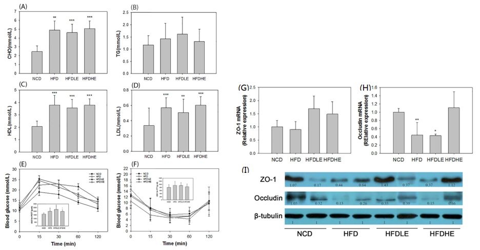 ?圖3. A-F:NLE對(duì)小鼠血脂、膽固醇、葡萄糖和胰島素耐受性的影響;G-I:NLE對(duì)小鼠緊密連接蛋白(ZO-1)和閉合蛋白的影響