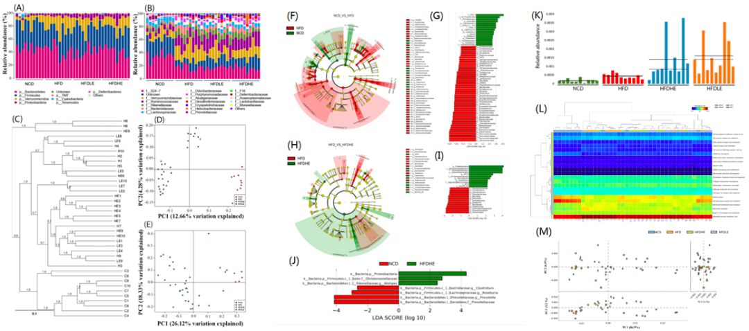 HFD導(dǎo)致小鼠腸道菌群的多樣性降低,然而NLE恢復(fù)了菌群多樣性(圖4)。Proteobacteria?、Epsilonproteobacteria、Helicobacteraceae?和Campylobacterales在HFD-HE組顯著富集(圖5H;5I),NCD與HFD-HE組的菌群結(jié)構(gòu)差異較?。▓D5J), NLE提高了HFD-HE和HFD-LE組Campylobacterales的豐度(圖5K)。NLE恢復(fù)了部分HFD導(dǎo)致的[K]轉(zhuǎn)錄和[G]碳水化合物代謝與運(yùn)輸?shù)墓δ茴愋停▓D5L)。