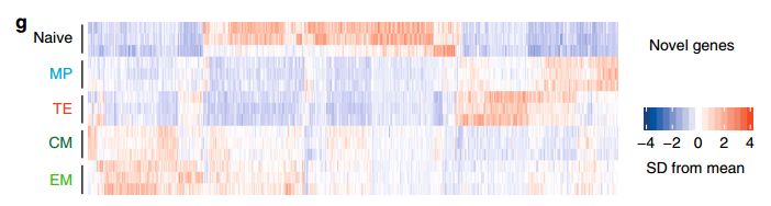 從LCMV感染小鼠中分離病毒特異性的CD8+T細(xì)胞亞群,對不同類型的細(xì)胞進(jìn)行RNA-seq。包括初始T細(xì)胞、終末分化效應(yīng)T細(xì)胞(short-livedterminal effector ,TE)、記憶前體T細(xì)胞(memory precursor ,MP)、中心記憶T細(xì)胞(central memory ,CM) 、效應(yīng)記憶T細(xì)胞(effector memory ,EM)?;跀?shù)據(jù)組裝分析,共鑒定到13909個unique genes,75%是蛋白編碼基因,25%是非編碼。在非編碼基因中,三分之一在數(shù)據(jù)庫中未收錄,因?yàn)檎J(rèn)為是新基因。這些新基因比已注釋非編碼基因有較高的表達(dá)水平,但這兩類基因均比編碼基因低表達(dá)。采用CPAT進(jìn)行編碼潛能分析,大部分新轉(zhuǎn)錄本包括單個外顯子,不到25%的新轉(zhuǎn)錄本包括2個及以上外顯子。雖然不具有蛋白編碼潛能,但大部分新基因在CD8+T細(xì)胞分化過程中表現(xiàn)出特異性,包括記憶細(xì)胞中的特異性表達(dá)。