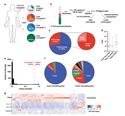 基于之前健康志愿者的測序數(shù)據(jù)(采用YFV-17D黃熱疫苗,分選CD8+T細(xì)胞,收集初始T細(xì)胞,14天CD8+T細(xì)胞、28天CD8+T細(xì)胞、記憶細(xì)胞),進(jìn)行轉(zhuǎn)錄組分析。鑒定出已注釋的3165個非編碼轉(zhuǎn)錄本,1098個未注釋的。與小鼠數(shù)據(jù)相比,人數(shù)據(jù)中也表現(xiàn)出編碼基因表達(dá)高于非編碼基因。同樣許多鑒定的新轉(zhuǎn)錄本是單外顯子,編碼潛能低于鼠鑒定的轉(zhuǎn)錄本。與小鼠數(shù)據(jù)類似,許多新轉(zhuǎn)錄本在T細(xì)胞分化中表現(xiàn)出特異性。