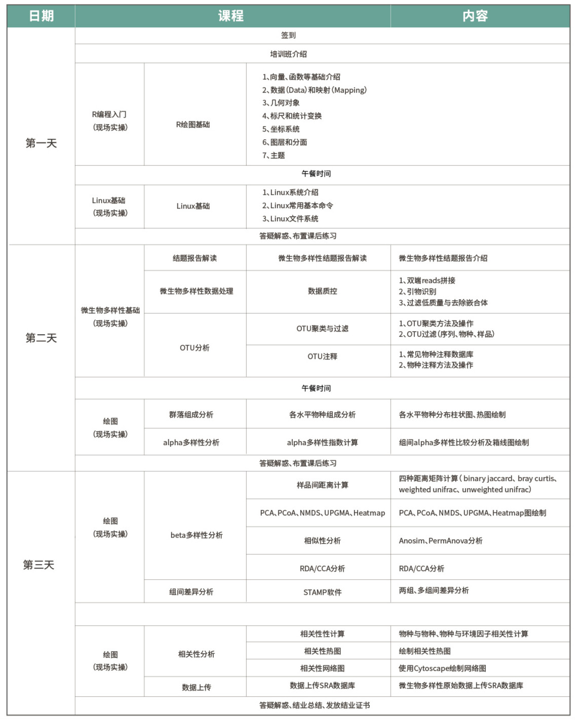 課程第一天為linux系統(tǒng)和R語言基礎(chǔ)的講解,帶大家熟悉分析中我們常用的命令與代碼,為后兩天的培訓(xùn)打好基礎(chǔ)!第二、第三天的授課講師是我們的微生物部經(jīng)手上千項(xiàng)目的研發(fā)經(jīng)理,其從實(shí)際結(jié)果出發(fā),為大家講解具體的技術(shù)原理和計(jì)算方法,原理了解了,那就到具體實(shí)操了,從實(shí)操中發(fā)現(xiàn)問題從而解決問題那才真的干貨??紤]人多顧不上?您放心,我們現(xiàn)場還有助教,可以隨時(shí)溝通,保證學(xué)習(xí)通暢!