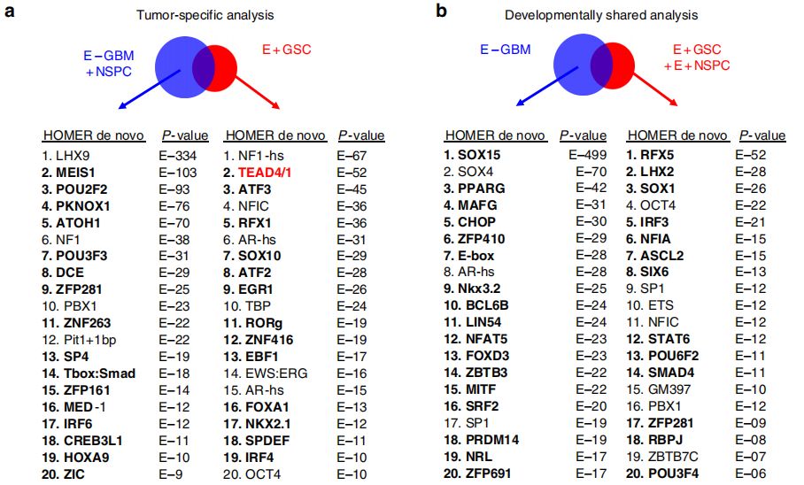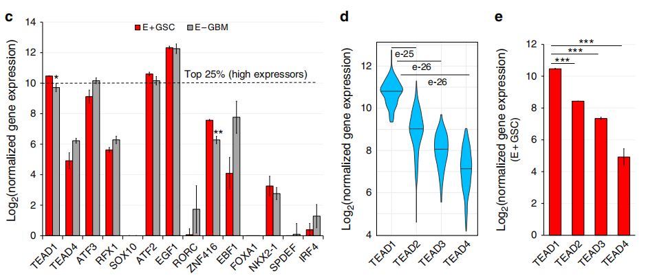 通過ATAC-seq分析染色質的可及性,不僅可以識別轉錄的調控區(qū)域,還可以推斷出其中的TF活性。在此,作者鑒定了27個GSC腫瘤特異性的TF motif,26個在E+GSC和E+NSPC中共有的發(fā)育相關TF motif。其中,TEAD1/4是具有很高活性的TF( motif是GSC特有peak中顯著富集,且基因表達水平高),其它候選TF包括ATF3、RFX1、FOXA1等。而E+GSC和E+NSPC中共有的發(fā)育相關TF包括SOX1、IRF3、NFIA等。然后,作者利用以前的類似的E+/E-GBM的RNA-seq數據,考慮到腫瘤特異性TF的基因表達水平,其中只有TEAD1在E+GSC中差異過表達。