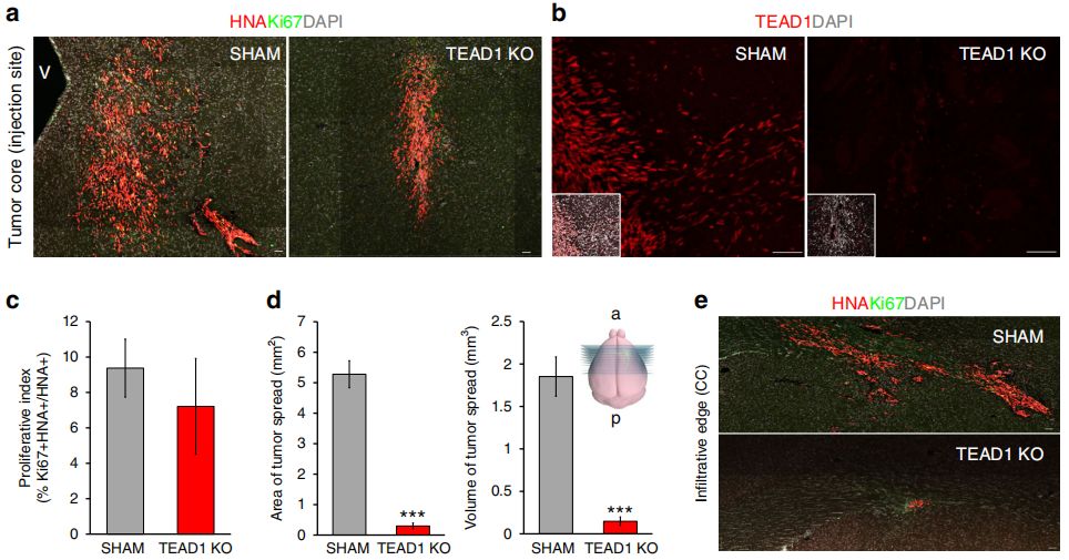 此外,作者分析了所有TEAD家族成員(1-4)在TCGA數據庫RNA-seq數據中的表達水平,發(fā)現(xiàn)TEAD1是150個GBM樣本中表達最高的TEAD家族成員,且在蛋白水平上,TEAD1在PDX膠質瘤中表達。因此,TEAD1是GBM腫瘤中表達最高、表達最廣泛的TEAD家族成員。