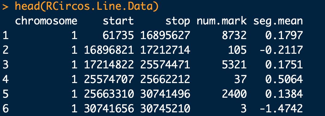 #?這個數(shù)據(jù)集是拷貝數(shù)變異的數(shù)據(jù),數(shù)據(jù)內(nèi)容如上圖,第一列?染色體編號,需要與第一步導(dǎo)入的染色體數(shù)據(jù)一致;第二列?突變位點在染色體片段起始位點;第三列?突變位點在染色體片段結(jié)束位點;第四列?突變位點拷貝數(shù);第五列?突變平均置信度