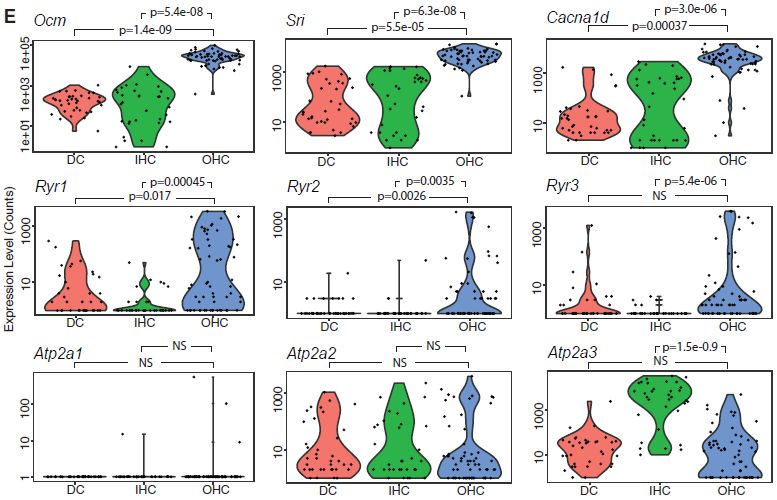 已知細(xì)胞類型marker基因高度差異表達(dá),例如prestin(Slc26a5),其在OHCs中穩(wěn)健且差異表達(dá)。與公布的OHC和IHC轉(zhuǎn)錄組數(shù)據(jù)進(jìn)行比較,搜索具有不一致排名的基因,假設(shè)通過AUC而不是表達(dá)水平對基因進(jìn)行排序?qū)⒃诟鼜V泛的表達(dá)水平上鑒定細(xì)胞類型定義基因。按AUC分類排名時(shí),兩個(gè)鈣相關(guān)基因Ocm和Sri在OHC定義基因列表中排名第一,甚至超過Slc26a5,排名第三(上圖2F)。先前已在OHC中報(bào)道了Ocm的表達(dá)。編碼蛋白質(zhì)oncomodulin(癌調(diào)蛋白)是鈣結(jié)合蛋白家族成員之一,它是耳蝸聽力擴(kuò)增所必需的。Sri編碼sorcin(可溶性耐藥相關(guān)鈣結(jié)合蛋白),一種在心肌細(xì)胞中表達(dá)的蛋白質(zhì),是鈣介導(dǎo)的興奮-收縮偶聯(lián)所必需的,通過抑制Ryr通道(Ca2+釋放通道/RyR受體)進(jìn)行鈣離子介導(dǎo)的鈣離子釋放?(CICR)。在肌細(xì)胞中,Ryr通道介導(dǎo)CICR,能夠從肌質(zhì)網(wǎng)中快速釋放Ca2+離子,從而產(chǎn)生對于肌肉收縮必不可少的時(shí)空限制性鈣火花。