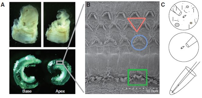與哺乳動(dòng)物耳蝸中的各種支持細(xì)胞類型相比,聽覺HC的豐度較低。為了估計(jì)小鼠耳蝸膜迷路中可用于單細(xì)胞分離的HC數(shù)量,據(jù)報(bào)道在成熟的小鼠耳蝸中約765個(gè)IHCs,通過對小鼠顳骨中心切片,細(xì)胞核計(jì)數(shù),估計(jì)小鼠膜性迷路中的細(xì)胞數(shù)為415,395,其中IHC和OHC比例僅為0.19%和0.59%。