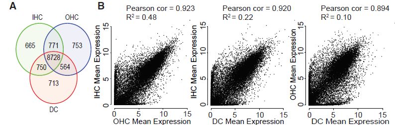 為了比較細(xì)胞類型之間表達(dá)譜,計(jì)算各cluster內(nèi)所有細(xì)胞中每個(gè)基因平均表達(dá)水平。通過維恩圖對平均表達(dá)譜比較,每種細(xì)胞類型約表達(dá)700個(gè)特異基因(OHC-753;?IHC-655;?DC-713;歸一化后counts>10)。且發(fā)現(xiàn)IHCs和DC具有高比例重疊(共享750個(gè)基因,與OHC和DC共享564個(gè)基因相比),但是IHC和OHC共享771個(gè)基因表達(dá)(圖2A)。為了更嚴(yán)格地測試每種細(xì)胞類型的轉(zhuǎn)錄相似性,使用所有基因進(jìn)行Pearson相關(guān)和R2回歸分析?;貧w分析,所有3組間比較中發(fā)現(xiàn)了強(qiáng)相關(guān)性,OHCs和IHC之間的相關(guān)性最高,OHCs和DC之間的相關(guān)性最低。OHC和DC表達(dá)譜最不相似可能反映了OHC高水平特化(圖2B)。