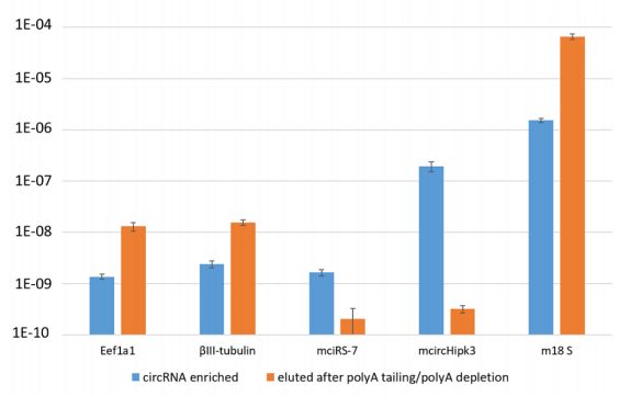 只有一小部分RNA是環(huán)狀的(例如,小鼠神經(jīng)系統(tǒng)中去rRNA的RNA庫中僅占約0.1%)。作者采用上述方法進(jìn)行circRNA-ONT測序,由于有些線性RNA分子對RNase R具有抗性,故而此方法比普通的去線性circRNA建庫多了一步:將剩余的線性RNA多聚腺苷酸化(poly A tailing)并使用poly(A)純化磁珠去除帶polyA尾的RNA分子。結(jié)果表明,該步驟使circRNA強(qiáng)烈富集。