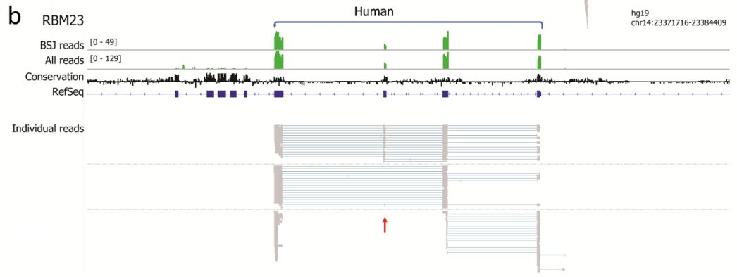 將所有小鼠和人跨越BSJ reads與各自的參考基因組比對,并定量比對到外顯子或內(nèi)含子區(qū)域的堿基對的數(shù)量。為了將分析集中于更豐富的circRNA中的內(nèi)含子保留和其他可變剪接事件,僅進(jìn)一步研究了具有10個或更多BSJ reads并具有高于3%的平均內(nèi)含子百分比的circRNA。作者發(fā)現(xiàn)3個人和4個小鼠circRNA具有內(nèi)含子保留,而39和57個circRNA包含分別在人和小鼠的RefSeq中未注釋的外顯子序列。CAMSAP1 是circRNA內(nèi)含子保留實例,其僅發(fā)生在人RNA中;LPXN circRNA是僅在人中表達(dá)的circRNA。
