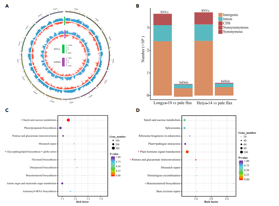 之前有報道稱栽培亞麻起源于白亞麻,作者將Longya-10與Heiya-14基因組分別與白亞麻進(jìn)行比較分析,在Longya-10中共鑒定到3,623,057 SNV和555,580 個InDel,Heiya-14中鑒定到3,686,366個SNV和557,691個InDel。分別有13.7%和14.2%的SNV落入CDS區(qū)域,其中一半以上是非同義變異。此外,與白亞麻相比,482個含有這些非同義變異的基因在兩個品種中得到了正選擇,其中23個基因與油脂和纖維生物合成相關(guān)。作者對這兩個品種中含有共同非同義SNV和INDEL的基因進(jìn)行了注釋。結(jié)果表明,在亞麻馴化過程中,開花時間相關(guān)基因FCA、果實開裂相關(guān)基因ALC、次生細(xì)胞壁生物合成相關(guān)基因MYB83和種子油脂生物合成相關(guān)基因LEC1子發(fā)生了變異。對這些變異基因進(jìn)行功能富集分析,發(fā)現(xiàn)植物激素信號轉(zhuǎn)導(dǎo)、戊糖和葡萄糖醛酸轉(zhuǎn)換、淀粉和蔗糖代謝以及神經(jīng)鞘糖脂生物合成相關(guān)通路顯著富集,表明植株結(jié)構(gòu)(株高、葉形、分枝方式、直立/匍匐等)、種子產(chǎn)量和/或營養(yǎng)品質(zhì)為主要馴化目標(biāo)。