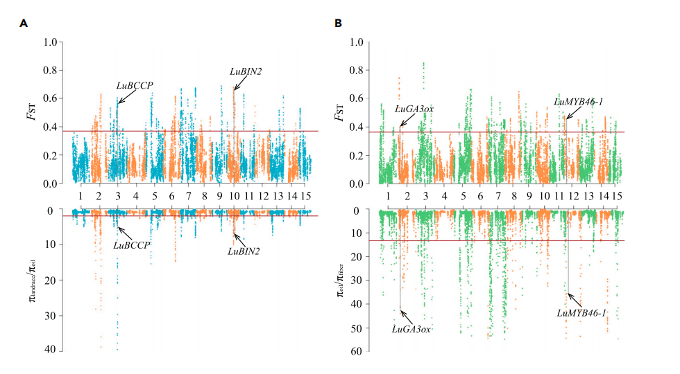 作物改良常常導(dǎo)致受選擇的區(qū)域核酸多態(tài)性降低,將油用亞麻群體和纖維亞麻群體分別與地方種比較分析,油用亞麻中檢測到108個選擇清除區(qū)域(長度為15.5Mb,1,958個基因),纖維亞麻中有60個選擇清除區(qū)域(長度為8.2Mb,1018個基因),27個選擇清除區(qū)域重疊。其中α生物素羧基載體蛋白(LuBCCP)、脂氧合酶(LuLOX)、脂肪?;鵄CP硫酯酶A(LuFatA)、脂質(zhì)轉(zhuǎn)移蛋白(LuLTP)和丙酮酸脫氫酶復(fù)合物E2組分(LuPDH-E2)等油脂相關(guān)基因以及種子大小相關(guān)基因LuBIN2LuGW5在油用亞麻中受到選擇。纖維亞麻中,次生細(xì)胞壁生物合成相關(guān)基因(LuMYB46-1LuXTHLuROPGAP3)和植物株高相關(guān)基因(LuGA3ox、LuGA20oxLuGID)受到選擇。