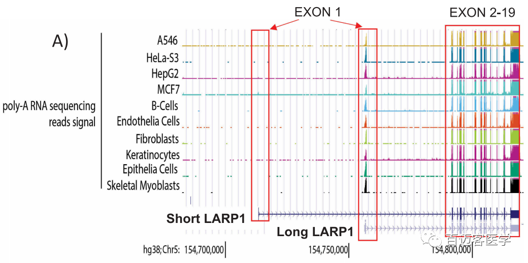 使用LARP1各個(gè)區(qū)域的抗體進(jìn)行的蛋白質(zhì)印跡WB實(shí)驗(yàn)產(chǎn)生了大約150/130kDa的雙鏈帶,這被解釋為代表了2種LARP1亞型。為了探索這一點(diǎn),作者系統(tǒng)地進(jìn)行了一系列計(jì)算機(jī)、轉(zhuǎn)錄組、生化和細(xì)胞分析,以闡明LARP1在癌癥和正常細(xì)胞中的真實(shí)表達(dá)情況。