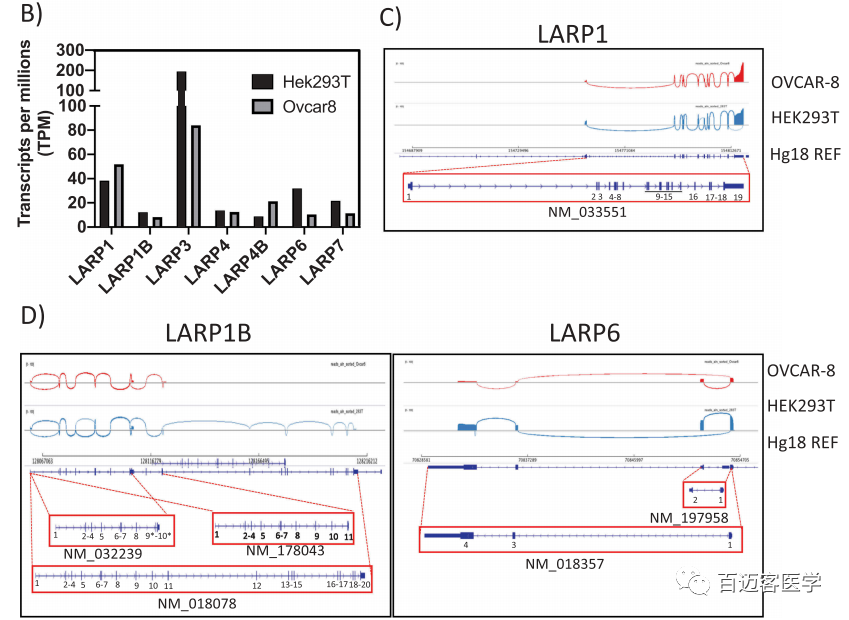 Nanopore全長轉(zhuǎn)錄組測序:為了進(jìn)一步了解LARP1 isoform的表達(dá),在HEK-293 T和OVCAR-8細(xì)胞(永生化的人類胚胎腎細(xì)胞和卵巢癌細(xì)胞系)中分別進(jìn)行了牛津納米孔測序技術(shù)(ONT全長轉(zhuǎn)錄組測序)(圖2B-D)。這種RNA直接測序技術(shù)可以檢測長讀長轉(zhuǎn)錄本isoform,并可以無PCR偏倚地定量轉(zhuǎn)錄本豐度。與人類基因組(Hg38)比對,并使用IGV可視化。在HEK-293T細(xì)胞中,檢測到總共2,038,842個(gè)轉(zhuǎn)錄本,而在OVCAR-8細(xì)胞的樣品中僅檢測到1,834,870個(gè)轉(zhuǎn)錄本。(根據(jù)百邁客的項(xiàng)目經(jīng)驗(yàn)大概每個(gè)樣本2G多的數(shù)據(jù)量)作者對所有比對到7個(gè)LARP家族成員的轉(zhuǎn)錄本進(jìn)行表達(dá)定量,校正各樣本數(shù)據(jù)量差異將其標(biāo)準(zhǔn)化為TPM(transcripts per million,每百萬轉(zhuǎn)錄本)(圖2B)。在LARP家族成員中,LARP3的轉(zhuǎn)錄本表達(dá)量最高(TPM=194)。相反,其他LARPs的表達(dá)值TPM遠(yuǎn)低于50,其中LARP1B和LARP4B的表達(dá)最低。且與前人研究一致,致癌性LARP1在OVCAR-8癌細(xì)胞(TPM 52)中的表達(dá)水平高于HEK-293 T細(xì)胞(TPM 38)中的表達(dá)水平。為了分析LARP1 sioform在這些細(xì)胞中的表達(dá),作者使用Sashima圖(圖2C)可視化剪接位點(diǎn)。使用這種RNA直接測序的nanopore全長轉(zhuǎn)錄組方法,在2個(gè)測試的細(xì)胞系中均未檢測到SI-LARP1。盡管LARPs的表達(dá)水平低于其他基因,例如GAPDH(在OVCAR-8細(xì)胞中TPM高達(dá)6396),因此LI-LARP1被鑒定為主要表達(dá)的LARP1亞型。作者還觀察到5′截短的LARP1轉(zhuǎn)錄本積累,LARP1B的3種isoform共表達(dá)(NM-018078,NM_178043,NM-032239),LARP6的2種isoform共表達(dá)(NM_197958,NM_018357)(圖2D)。對于其他LARP,能夠確認(rèn)ONT測序檢測到的主要轉(zhuǎn)錄本與經(jīng)典isoform相對應(yīng)。