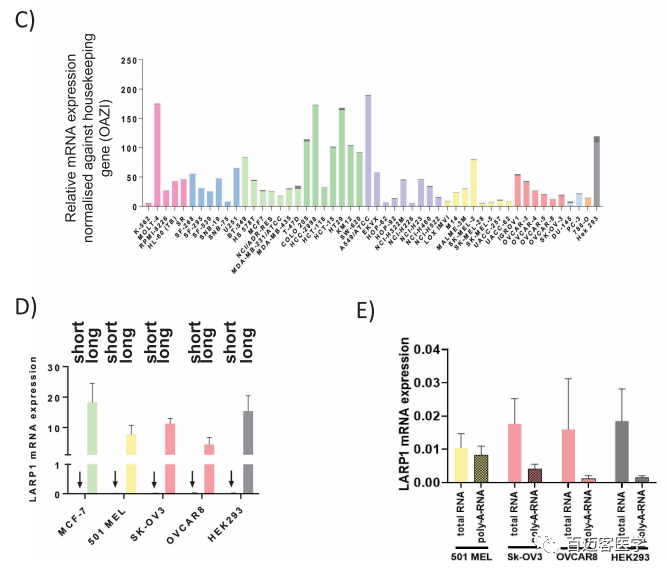 4、NCI-60幾種癌細(xì)胞系隨機(jī)引物及oligo dT反轉(zhuǎn)錄qPCR驗(yàn)證SI-LARP1和LI-LARP1 isoform表達(dá):長LARP1 isoform(LI-LARP1)在廣泛的癌癥和正常細(xì)胞中是主要表達(dá)的形式,而SI-LARP1 mRNA(如果表達(dá)的話)以低水平和不成熟的形式存在。