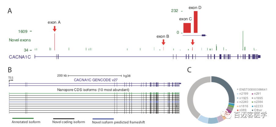 在CACNA1C基因座內(nèi)總共注釋了39個(gè)潛在的新外顯子,其中38個(gè)在至少2個(gè)人或組織中被識(shí)別,并在每個(gè)文庫(kù)中得到至少5條nanopore reads的支持(圖2A)。通過(guò)PCR和Sanger測(cè)序確認(rèn)了新的外顯子與其周圍的注釋外顯子之間的剪接連接,從而驗(yàn)證了四個(gè)新的外顯子。這種新的外顯子的成功驗(yàn)證提供了很高的可信度,即通過(guò)納米孔測(cè)序鑒定的新的外顯子是真實(shí)的,并且被整合到CACNA1C轉(zhuǎn)錄本中。表達(dá)量最高的10條轉(zhuǎn)錄本中,有9條是新的且其中有8條被預(yù)測(cè)保持CACNA1C閱讀框架,這表明這些最豐富的新轉(zhuǎn)錄本中有一些編碼功能不同的蛋白質(zhì)異構(gòu)體(圖2B,C)。這些結(jié)果表明,新的CACNA1C轉(zhuǎn)錄本表達(dá)豐富,數(shù)量也很多,目前的注釋缺少許多最豐富的CACNA1C轉(zhuǎn)錄本。