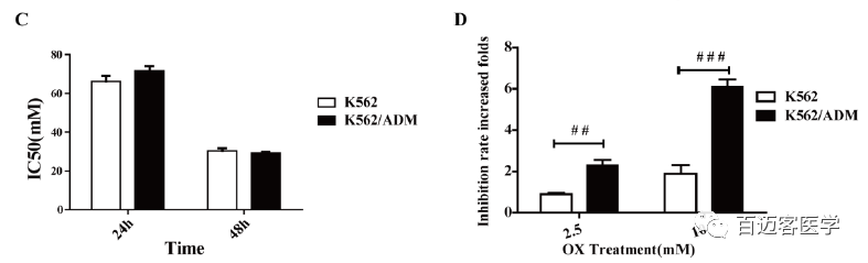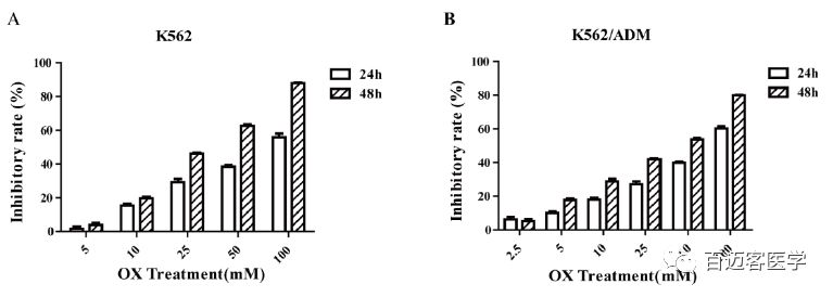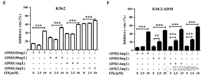 如圖,單獨用草酸處理的兩個細(xì)胞系均呈現(xiàn)時間和劑量依賴性細(xì)胞毒性,但是細(xì)胞毒性相對較低。相比于單獨用ADM處理,用ADM和草酸聯(lián)合處理后,K562細(xì)胞和K562/ADM細(xì)胞增殖抑制率分別提高了為2.28±0.56倍和6.08±0.77倍,K562/ADM細(xì)胞增殖抑制率的增加倍數(shù)明顯高于K562細(xì)胞。