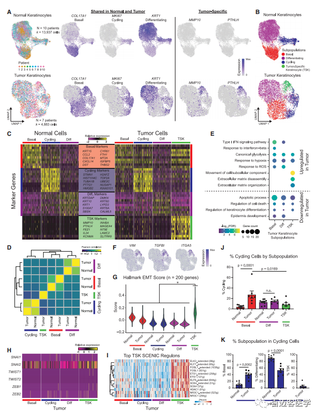 重新聚類(lèi)正常上皮細(xì)胞后,在正常皮膚中觀(guān)察到3個(gè)主要的角質(zhì)細(xì)胞(KC)亞群(基底、循環(huán)、分化細(xì)胞)。典型相關(guān)分析表明腫瘤KCs廣泛重現(xiàn)了正常(基底、循環(huán)、分化細(xì)胞)亞群,在正常皮膚和cSCC中有幾個(gè)共享的標(biāo)記基因(圖2A-D)。有趣的是,在腫瘤細(xì)胞聚類(lèi)中出現(xiàn)了與正常皮膚無(wú)明顯關(guān)聯(lián)的第四個(gè)KC亞群,即TSK亞群(圖2B-D)。事實(shí)上,在這一簇與其他腫瘤細(xì)胞區(qū)別開(kāi)來(lái)的100個(gè)基因中,有99個(gè)基因在腫瘤組織中的表達(dá)明顯高于正常組織。TSK標(biāo)記基因與細(xì)胞運(yùn)動(dòng)和細(xì)胞外基質(zhì)分解有關(guān),暗示了它的侵入性(圖2E)。TSKs表達(dá)經(jīng)典的上皮-間質(zhì)轉(zhuǎn)化(EMT)標(biāo)志物,如VIM和ITGA5(圖2F);但是EMT類(lèi)似的TSK細(xì)胞缺乏經(jīng)典表達(dá)EMT轉(zhuǎn)錄因子(圖2H)。因此,我們通過(guò)單細(xì)胞調(diào)控網(wǎng)絡(luò)進(jìn)行推理和聚類(lèi),提名AP1和ETS家族成員為潛在控制TSKs的TFs(圖2I)。TSK細(xì)胞也表現(xiàn)出較大的EMT評(píng)分范圍,提示細(xì)胞狀態(tài)具備高可塑性(圖2G),與EMT連續(xù)模型一致。基底細(xì)胞(Basal)在腫瘤中的發(fā)生率約是正常循環(huán)細(xì)胞的四倍(圖2K)??偟膩?lái)說(shuō),cSCC表現(xiàn)出分化失常,基底細(xì)胞迅速增殖,并出現(xiàn)表達(dá)EMT連鎖基因的TSK亞群。
