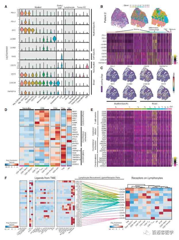 為了探究何種細(xì)胞類(lèi)型影響了cSCC的免疫活動(dòng),我們調(diào)查了熟知的免疫抑制基因(圖4A),CD274(PD-L1)和PDCD1LG2(PD-L2)等基因在ST中表現(xiàn)出空間簇特異性模式,與特定細(xì)胞類(lèi)型的共定位一致,骨髓特異性因子在炎癥前沿占據(jù)優(yōu)勢(shì)地位(圖4B&C)。衰竭的CD4和CD8 T細(xì)胞亞群除表達(dá)細(xì)胞毒性基因外,還表達(dá)抑制性受體和衰竭標(biāo)志物(圖4D)。在空間位置上,T細(xì)胞轉(zhuǎn)錄本出現(xiàn)在炎癥前沿和免疫相關(guān)細(xì)胞簇中(圖4E)。并且發(fā)現(xiàn)scRNA-seq中幾種趨化因子受體在重疊的T細(xì)胞亞群中高表達(dá)。Tregs特異性表達(dá)CCR8,這可能是一個(gè)潛在藥物靶點(diǎn)(圖4F)。綜上所述,這些結(jié)果強(qiáng)調(diào)了參與免疫抑制機(jī)制的多種細(xì)胞類(lèi)型,包括誘導(dǎo)DC和衰竭T細(xì)胞共抑制信號(hào),以及招募Tregs。