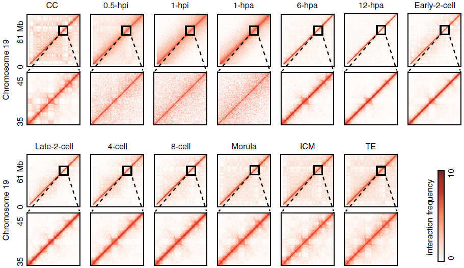 不同時期的胚胎的染色質三維構象見下圖,圖中分別展示了分辨率為100kb和40kb時的Hi-C互作矩陣。將CC(Cumulus cell)核注入無核卵母細胞后,染色質結構TADs和Compartments迅速溶解,并在6-hpa胚胎中部分恢復。令人驚訝的是,1-hpi和1-hpa單細胞胚胎遠端相互作用明顯較少,并顯示出一致的相互作用模式,這與中期染色質組織狀態(tài)高度相似。