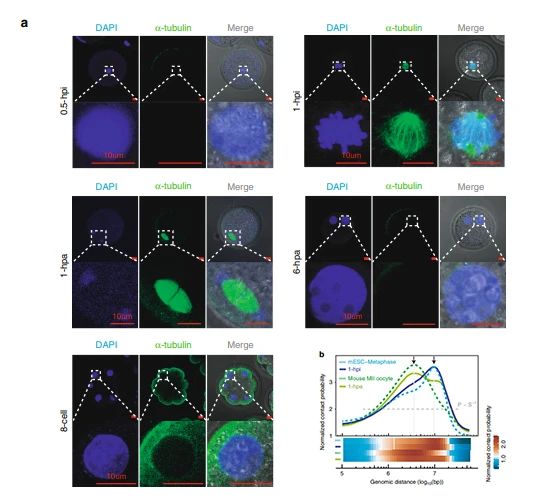 免疫熒光染色在1-hpi和1-hpa胚胎中檢測到紡絲裝置凝聚的染色體,這與其他階段胚胎中帶有核膜的間期染色質形態(tài)不同(圖2a)。進一步分析表明,1-hpi胚胎的P(s)曲線與小鼠ESC中期相似,在10Mb時迅速下降,而1-hpa胚胎的P(s)曲線與小鼠MII卵母細胞相似,在4Mb時突然下降(圖2b)。這表明當供體細胞在去核卵母細胞中被人工激活1個小時(1-hpa)后,基因組經歷了從類有絲分裂中期向類第二次減數分裂中期的轉變。