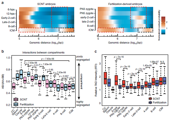SCNT胚胎發(fā)育6小時(6-hpa)進入擬原核期(對應正常受精胚胎PN3時期)后,出現了較弱的TADs(拓撲相關結構域)信號,并持續(xù)減弱至早期2細胞期,在2細胞晚期到8細胞卵裂期逐步重新建立,直到囊胚期成熟。