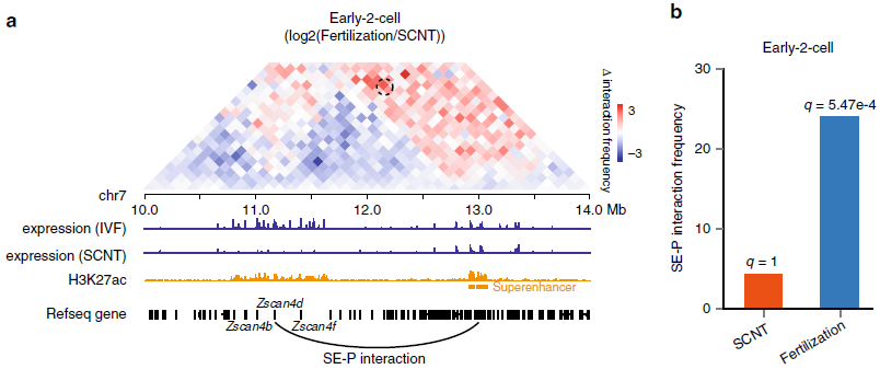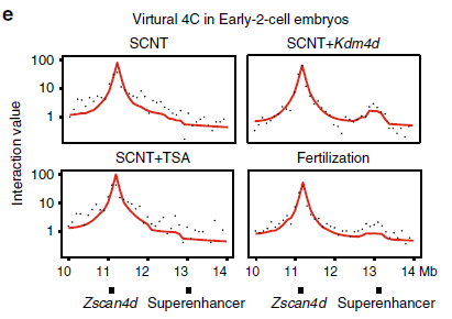 研究表明小鼠SCNT胚胎在合子基因組激活(ZGA)時期有大量的基因未能被正常激活。于是,作者探究了染色質空間結構的異常是否會導致增強子與啟動子之間的相互作用無法成功建立。在早2細胞胚胎,發(fā)現關鍵基因Zscan4d的啟動子與上游的超級增強子的SE-P相互作用在受精卵中很明顯,而在SCNT胚胎中則不存(圖5)。