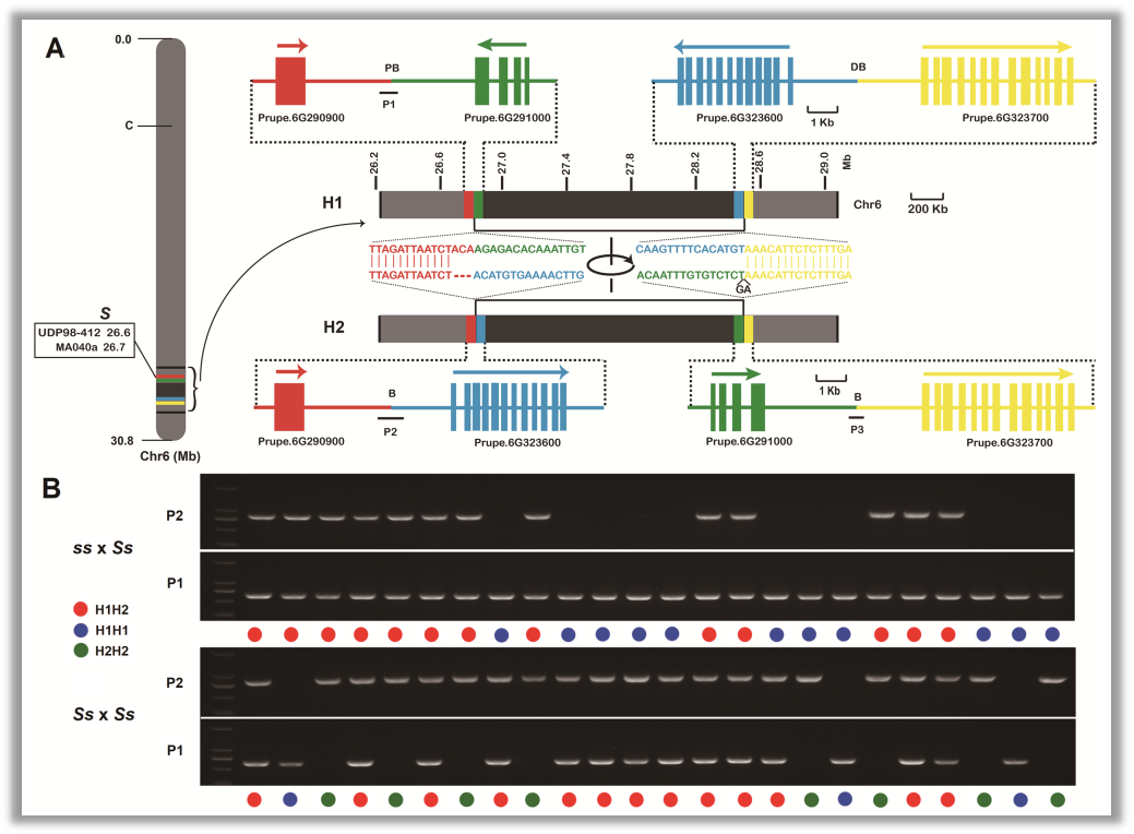 桃起源于250萬(wàn)年前的中國(guó)青藏高原的西南部,在中國(guó)已有4000年的栽培史,其中有一個(gè)獨(dú)特變種—蟠桃,蟠桃果實(shí)呈扁平狀,體積較小,和我們常見的圓形桃子有明顯區(qū)別,雖然長(zhǎng)相一般,不過它具有酸度低、糖含量高等優(yōu)異品質(zhì),受到越來(lái)越多的消費(fèi)者喜愛。蟠桃果實(shí)扁平的特征受6號(hào)染色體上的S位點(diǎn)調(diào)控,同時(shí)S位點(diǎn)與控制鮮重和果實(shí)敗育位點(diǎn)緊密連鎖。關(guān)于S位點(diǎn)的基因定位研究有多次報(bào)道,發(fā)現(xiàn)2個(gè)臨近候選基因(CAD1LRR-RLK)與果實(shí)扁平的性狀共分離,但后續(xù)又有研究顯示這2個(gè)基因并非與CAD1LRR-RLK共分離。所以,對(duì)于扁桃扁平性狀的遺傳基礎(chǔ)研究仍待繼續(xù)。