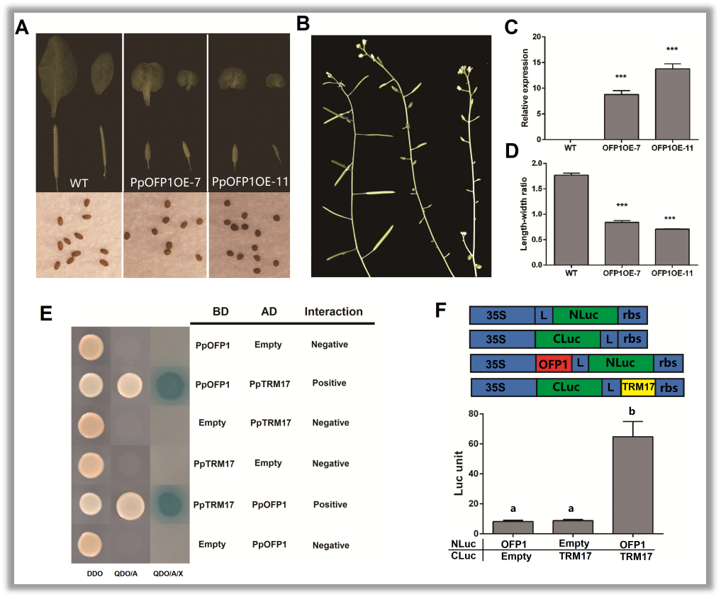 前期研究發(fā)現(xiàn)OFP基因家族與TRM基因家族存在互做來(lái)調(diào)控植物器官形狀,于是作者分析了可能與PpOFP1互做的TRM基因,在桃子基因組中篩選到1個(gè)可能的互做基因PpTRM17,通過酵母雙雜(圖4E)和螢火蟲熒光素酶雙分子互補(bǔ)實(shí)驗(yàn)(圖4F),發(fā)現(xiàn)PpOFP1能夠與PpTRM17存在互做關(guān)系。