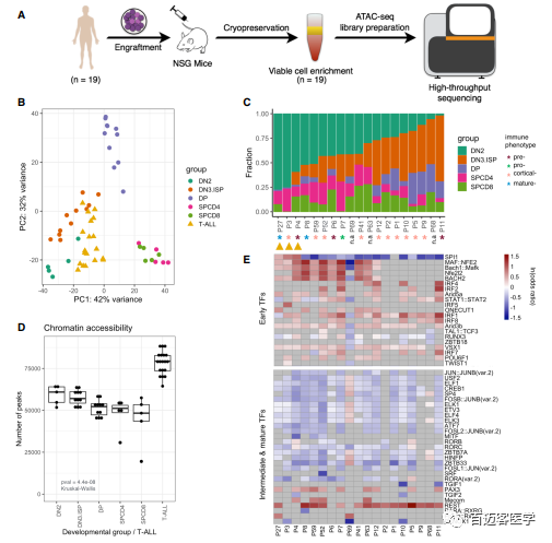 29個(gè)PDX模型中有7個(gè)對(duì)應(yīng)19個(gè)T-ALLs患者中的4個(gè)(圖4A),之前被證明可以再現(xiàn)原發(fā)性白細(xì)胞樣本的染色質(zhì)可及性,與原始患者相比,ATAC文庫(kù)富集在TSS區(qū)域。白血病樣品2,823個(gè)細(xì)胞特征OCRs PCA分析顯示與健康T細(xì)胞分離,將其定位在早期DN2和DN3&ISP發(fā)育階段附近(圖4B)。19例白血病患者中16例早期發(fā)育組DN2和DN3&ISP至少占40%(圖4C)。值得注意的是,即使是被免疫表型分類(lèi)為成熟的T-ALLs也表現(xiàn)出早期DN2染色質(zhì)可及性概況的實(shí)質(zhì)性貢獻(xiàn),表明即使是以成熟免疫表型為特征的T-ALL亞型也類(lèi)似于未成熟的胸腺前體(圖4C)。通過(guò)ATAC-Seq peaks數(shù)量衡量,染色質(zhì)可及性隨著T細(xì)胞的成熟而降低(圖4D)。雖然T-ALLs與早期DN2群體最相似,但是T-ALLs的peaks數(shù)明顯高于分類(lèi)后的T細(xì)胞群(圖4D)。132個(gè)早期特異性TF結(jié)合位點(diǎn)如Bach1/2、Maf和Nfe212,109個(gè)在白血病中顯著富集,然而115個(gè)中間和成熟特異性TFs中只有12個(gè)在T-ALLs中富集(圖4E)。在T細(xì)胞白血病中,以正常DP和SP階段為特征的TFs結(jié)合位點(diǎn)motifs趨向減少(圖4E)。