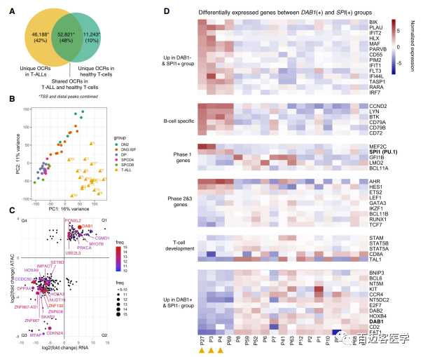 由于患者異質(zhì)性較高(圖5B),作者對(duì)每個(gè)患者進(jìn)行了DESeq2差異分析鑒定復(fù)發(fā)事件。與健康T細(xì)胞前體相比,作者在至少5個(gè)T-ALLs中鑒定出292個(gè)差異基因和差異可及性O(shè)CRs(圖5C)。102個(gè)峰/基因可及性強(qiáng)并過(guò)表達(dá),191個(gè)峰/基因可及性弱并低表達(dá)(圖5C)。4例未表達(dá)DAB1的患者(P3、P4、P27和P69)形成了一個(gè)不同的亞群其特征是SPI1過(guò)表達(dá),發(fā)育早期DN2貢獻(xiàn)率特別高(圖4C),3例患者TF SPI1(PU.1)結(jié)合位點(diǎn)可及性更高(圖4E)?;虮磉_(dá)和染色質(zhì)可及性差異分析顯示,表達(dá)SPI1的患者以基因過(guò)表達(dá)/超可及性為特征,并決定了T細(xì)胞發(fā)育的早期第一階段。這些基因包括MEF2C、MEIS1HOXA9 ,基因特征為B細(xì)胞前體如LYNBTK、cyclin D2、CD79A、CD79BCD72(圖5D)。DAB1過(guò)表達(dá)和超可及性T-ALLs趨向于T細(xì)胞發(fā)育后期2和3階段過(guò)表達(dá)基因如TCF7、LEF1RUNX1(圖5D)。綜上所述,這些數(shù)據(jù)涉及到DAB1和SPI1一個(gè)未知的相互排斥的生物學(xué)意義,并將T細(xì)胞發(fā)育階段,即兒童T- ALLs可能起源于成熟T細(xì)胞發(fā)育途徑的不同層次,盡管早期水平始終一致。