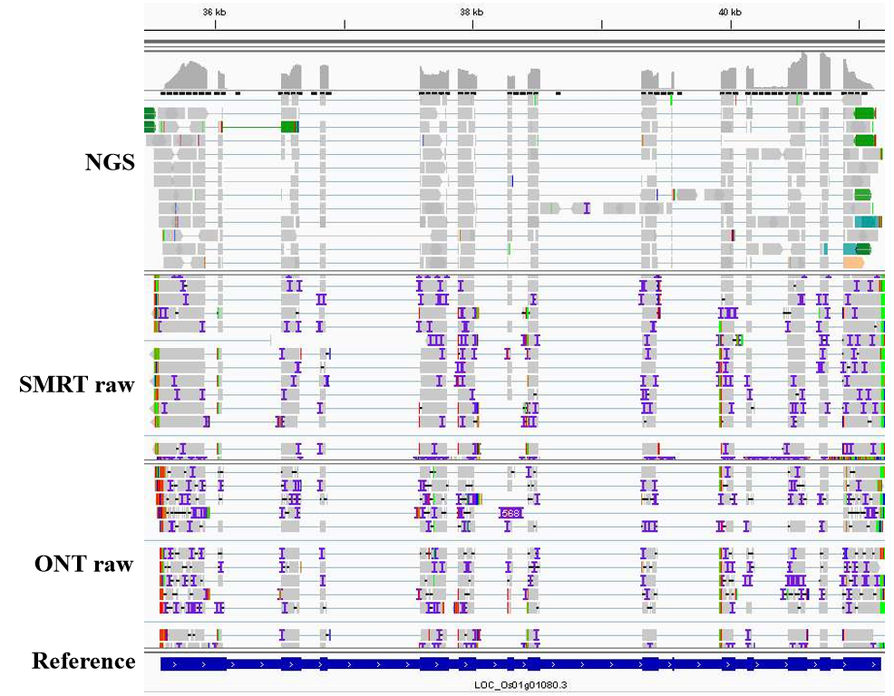 基于三代測(cè)序平臺(tái)可以直接獲取轉(zhuǎn)錄本的5ˊ到3ˊ高質(zhì)量全長(zhǎng)序列,無(wú)需組裝,一條read即可跨越全長(zhǎng)轉(zhuǎn)錄本,因此通過(guò)將read比對(duì)基因組就能夠非常容易的確定基因在基因組上的位置和其完整結(jié)構(gòu),因而非常有利于基因的注釋工作,且準(zhǔn)確性較高(參見(jiàn)下圖以水稻一個(gè)基因?yàn)槔?/p>