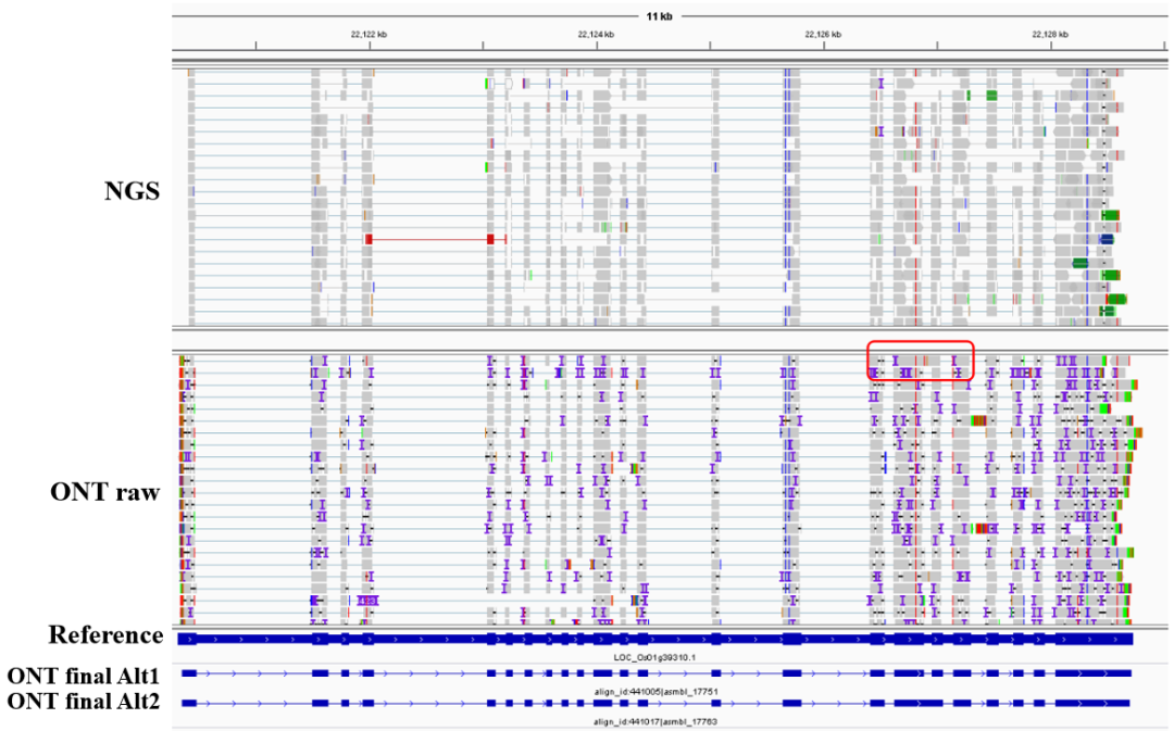 圖5中分別展示了RNA-seq和ONT原始數(shù)據(jù)比對(duì)結(jié)果,參考基因的結(jié)構(gòu)和經(jīng)過(guò)NanoGAP糾正和聚類后此位置轉(zhuǎn)錄本的結(jié)構(gòu)。其中NanoGAP預(yù)測(cè)到的ONT final Alt1轉(zhuǎn)錄本,其結(jié)構(gòu)與參考基因結(jié)構(gòu)完全一樣,證明我們采ONT數(shù)據(jù)進(jìn)行預(yù)測(cè)的高準(zhǔn)確性。同時(shí)NanoGAP預(yù)測(cè)到的一個(gè)新的可變剪接ONT final Alt2,表明擁有更長(zhǎng)讀長(zhǎng)的ONT在獲取可變剪接方面存在一定優(yōu)勢(shì)。