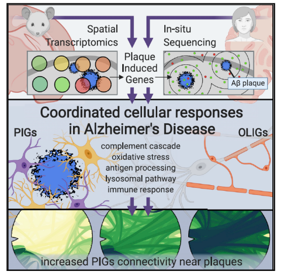 簡(jiǎn)述:本文結(jié)合空間轉(zhuǎn)錄組(ST)和原位測(cè)序(ISS)研究人鼠大腦,揭示了兩種由淀粉樣蛋白斑沉積誘導(dǎo)的的阿爾茲海默癥(AD)多細(xì)胞基因網(wǎng)絡(luò)—-斑塊誘導(dǎo)基因(PIG)網(wǎng)絡(luò)和少突膠質(zhì)細(xì)胞基因(OLIG)響應(yīng)。