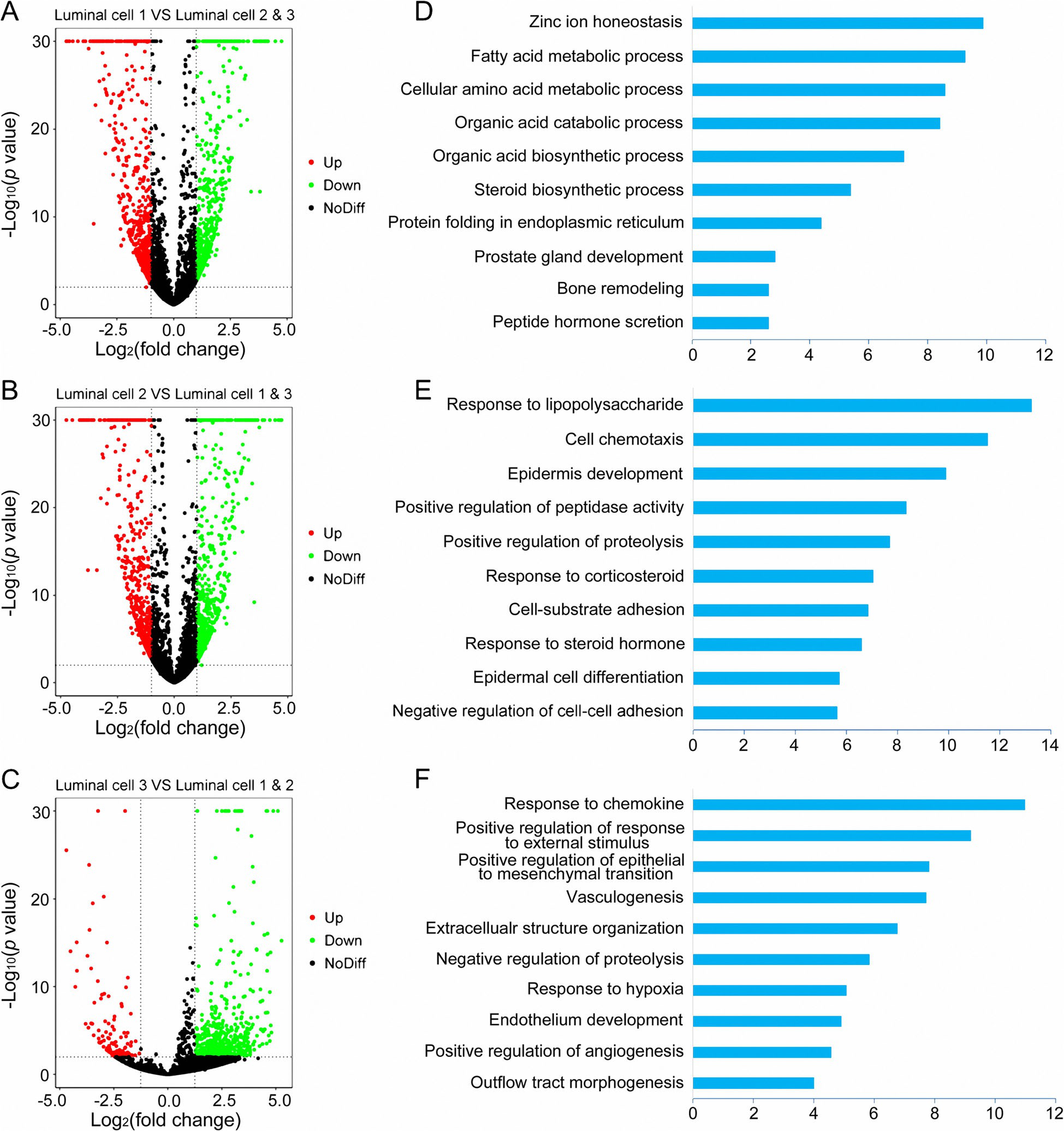 為了進(jìn)一步確定每個(gè)管腔簇在PCa發(fā)生和發(fā)展中的潛在作用,作者進(jìn)行了功能增強(qiáng)。1型管腔細(xì)胞上調(diào)的基因主要富集于參與癌癥進(jìn)展的代謝過程,如脂肪酸代謝過程、甾體生物合成過程和肽類激素分泌,表明1型管腔細(xì)胞確實(shí)是惡性細(xì)胞(圖3a,d)。2型細(xì)胞中蛋白水解酶和胞漿蛋白水解活性均為陽性,提示細(xì)胞內(nèi)蛋白水解活性和2型細(xì)胞的高表達(dá)有關(guān)。有趣的是,2型管腔細(xì)胞中其他高表達(dá)的基因在正常前列腺發(fā)育過程中豐富,包括表皮發(fā)育、表皮細(xì)胞分化和對(duì)類固醇激素的反應(yīng)(圖3b,e)。綜合起來,2型管腔細(xì)胞被鑒定為惡性程度相對(duì)較低的細(xì)胞。為了進(jìn)一步驗(yàn)證這一觀點(diǎn),我們對(duì)從成對(duì)比較中獲得的每個(gè)亮度DEG進(jìn)行GO分析,并得到類似的結(jié)果。在3型管腔細(xì)胞中表達(dá)的上調(diào)基因主要參與腫瘤遷移相關(guān)的過程,如血管生成、上皮-間質(zhì)轉(zhuǎn)換的正調(diào)控和內(nèi)皮細(xì)胞的發(fā)育,表明3型管腔細(xì)胞也是惡性細(xì)胞(圖3c,f)。