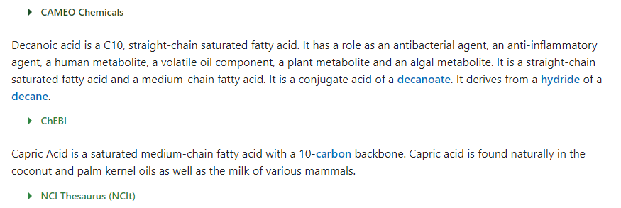 Pubchem(https://pubchem.ncbi.nlm.nih.gov/),它是NCBI下的一個(gè)大型的、綜合性的化合物數(shù)據(jù)庫,目前收錄了1億多種化合物信息,支持名稱、縮寫、化學(xué)式、系統(tǒng)命名等多種方式檢索,其結(jié)果包含了化合物的各種命名、相關(guān)聯(lián)的數(shù)據(jù)庫信息、結(jié)構(gòu)、分類、理化性質(zhì)、文獻(xiàn)、質(zhì)譜圖等多種信息。其中頁面開頭的摘要部分可快速了解到該物質(zhì)的特性、生物功能等信息,根據(jù)提供的文獻(xiàn)信息可幫助我們了解目前的研究情況。今天小編以“癸酸”為例教大家如何快速了解一個(gè)陌生的代謝組化合物。首先我們在主頁搜索欄中輸入癸酸英文名Decanoic acid,點(diǎn)擊搜索后會(huì)得到多個(gè)結(jié)果,置頂?shù)囊话銥樽罴哑ヅ?,這里是完全一致的,可以確認(rèn)就是這個(gè)結(jié)果。