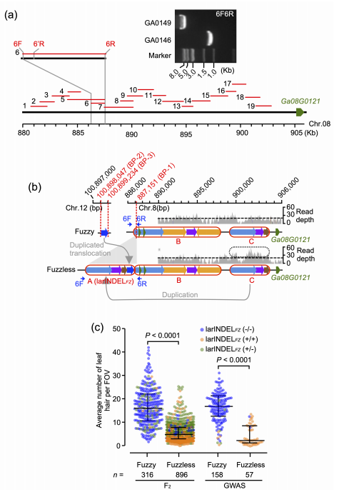 為了驗證插入片段larINDELFZ,作者利用19個重疊引物在具有代表性的短絨和無絨材料(GA0146和GA0149)中進行序列分析,發(fā)現(xiàn)短絨材料中有一個大小為6226 bp的插入片段larINDELFZ(圖2a);進一步分析發(fā)現(xiàn),該插入片段由一個約5?kb的重復序列和一個約1.2?kb的易位片段組成(圖2b);作者在GWAS群體以及GA0146和GA0149構建的包含1212單株的F2群體中分析larINDELFZ和表型的相關性,結果表明,位于亞洲棉第8染色體上的6226?bp的larINDELFZ與種子短絨和葉茸毛顯著相關(圖2c)。