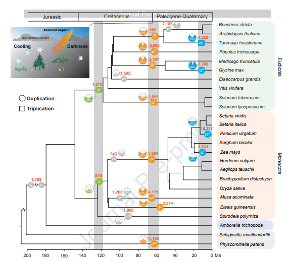 多倍化(polyploidy)或全基因組加倍(whole genome duplication, WGD)事件使基因組內(nèi)的所有基因都發(fā)生重復(fù),為生物進(jìn)化提供了原始的遺傳材料,被認(rèn)為是進(jìn)化的加速器。全基因組復(fù)制事件在真菌或動(dòng)植物中都有發(fā)生,是基因組中基因數(shù)量變化、基因新功能的形成、基因重排等的重要推動(dòng)力。