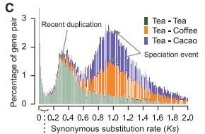 KS:全基因組加倍事件會(huì)產(chǎn)生大量的同源基因,反映在Ks值上便是會(huì)有大量的Ks值接近的同源基因?qū)Φ漠a(chǎn)生,Ks值峰就對(duì)應(yīng)了全基因組加倍事件的存在。