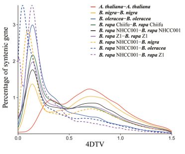 由于在同一基因組上共線性的染色體片段中有旁系同源的基因集,因此可以通過(guò)這些成對(duì)的共線性片段追溯目的物種曾經(jīng)的復(fù)制事件。通過(guò)研究全基因組復(fù)制事件,可以確定物種發(fā)生全基因組倍增時(shí)間,同時(shí)也通過(guò)分化時(shí)間的比對(duì)來(lái)判斷復(fù)制是發(fā)生在分化之前還是分化之后。常用方式:KS/4DTV